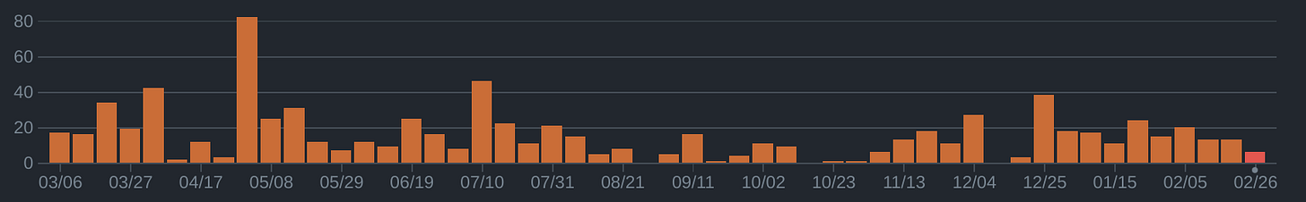 You can also see the number of commits to the repository over time - these guys are killing it.